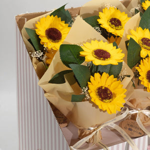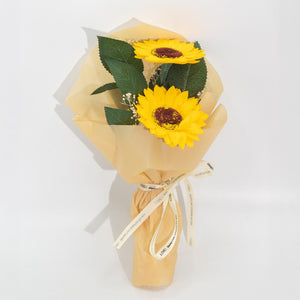 Brighten any room with this charming Soap Flower Two Sunflower Bouquet. Handcrafted from premium soap, these vibrant yellow sunflowers feature delicate white accents and realistic petal details. Elegantly wrapped in decorative paper and tied with ribbon, this mini bouquet serves as a stunning home decoration or a thoughtful gift for any occasion. Each flower can also be used in your bath for a luxurious, aromatic experience. Perfect for adding warmth and joy to your space while enjoying the subtle fragrance and skincare benefits of artisanal soap flowers.